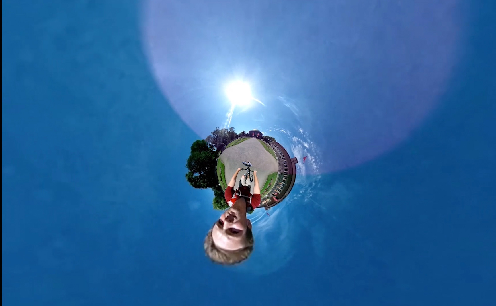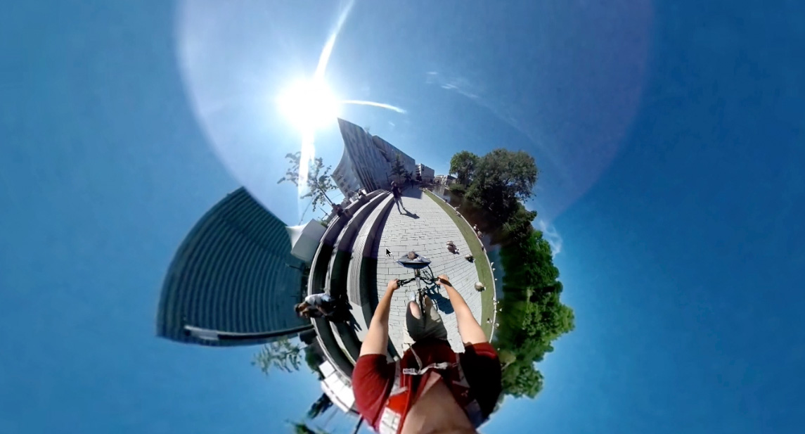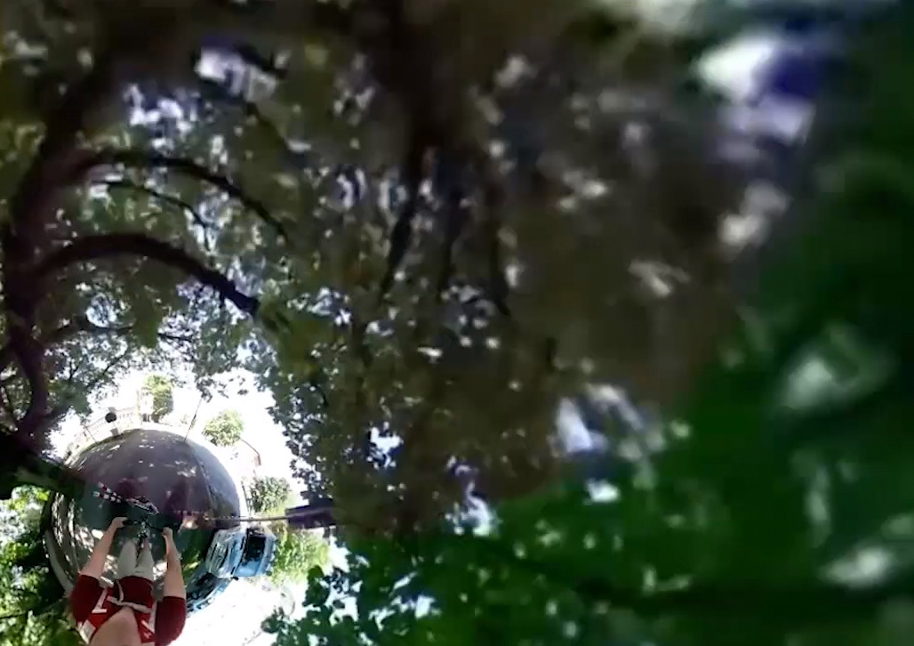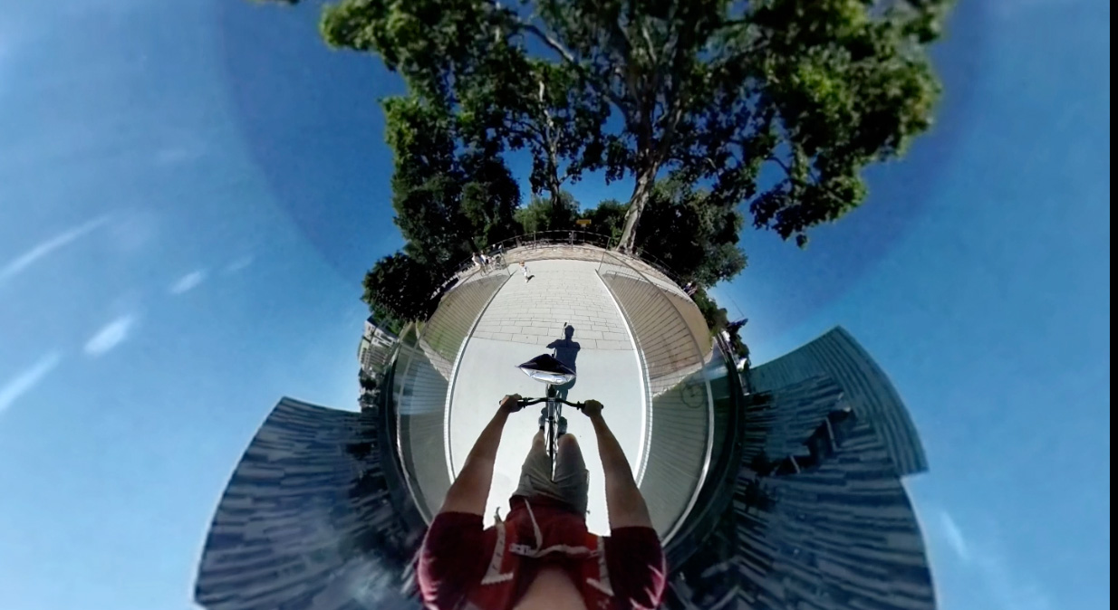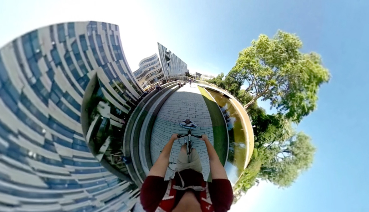 Patrick Kruse durchfährt mit seinem Fahrrad den Hofgarten in unterschiedlichen Richtungen, dabei nimmt er mit einer 360 Grad Kamera die gesamte Umgebung auf.